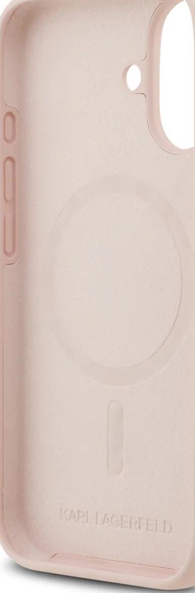 Inside, a smooth microfibre lining cushions your phone from scratches, while the outer silicone layer absorbs shocks and protects against bumps and daily wear. The built-in MagSafe ring ensures perfect magnetic alignment for fast wireless charging and compatibility with all MagSafe accessories. Finished with Karl Lagerfeld’s signature artwork, this case brings luxury branding and dependable protection together in a stunning soft-pink design.