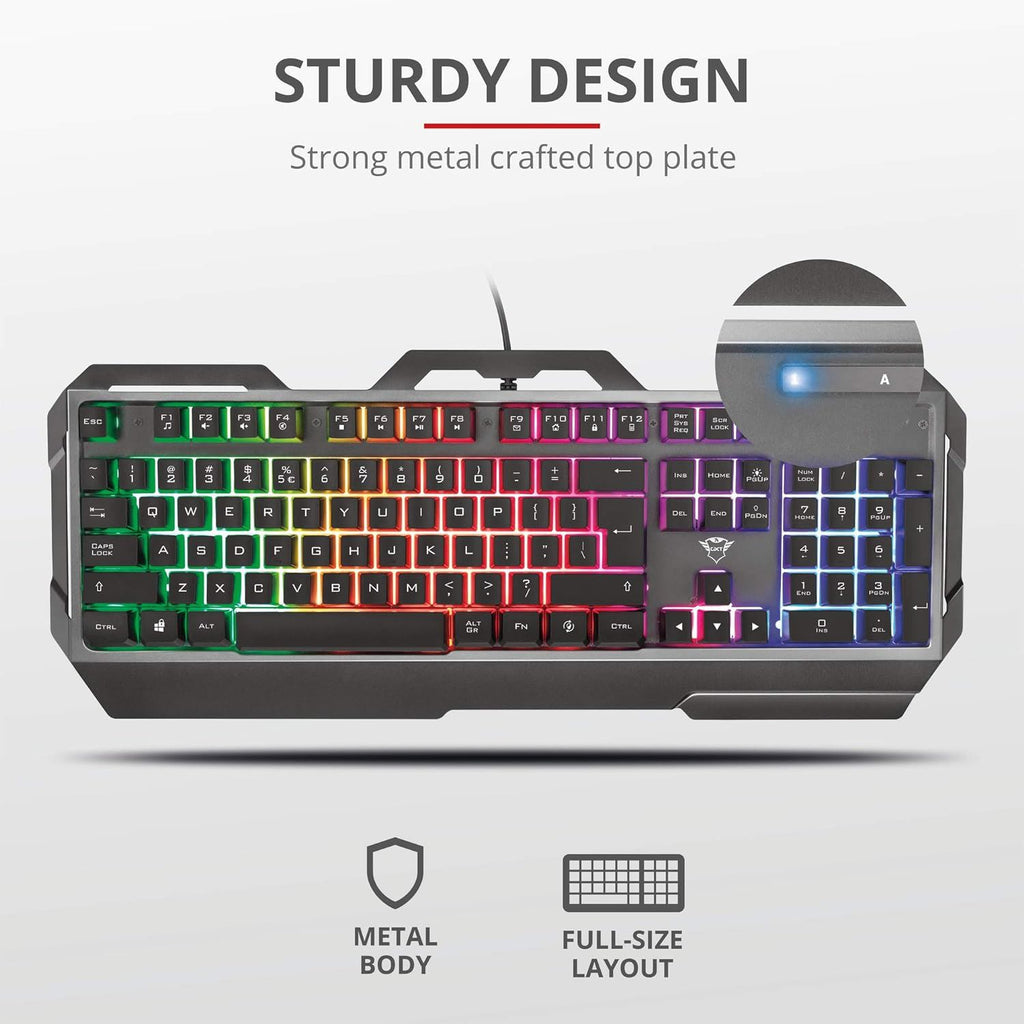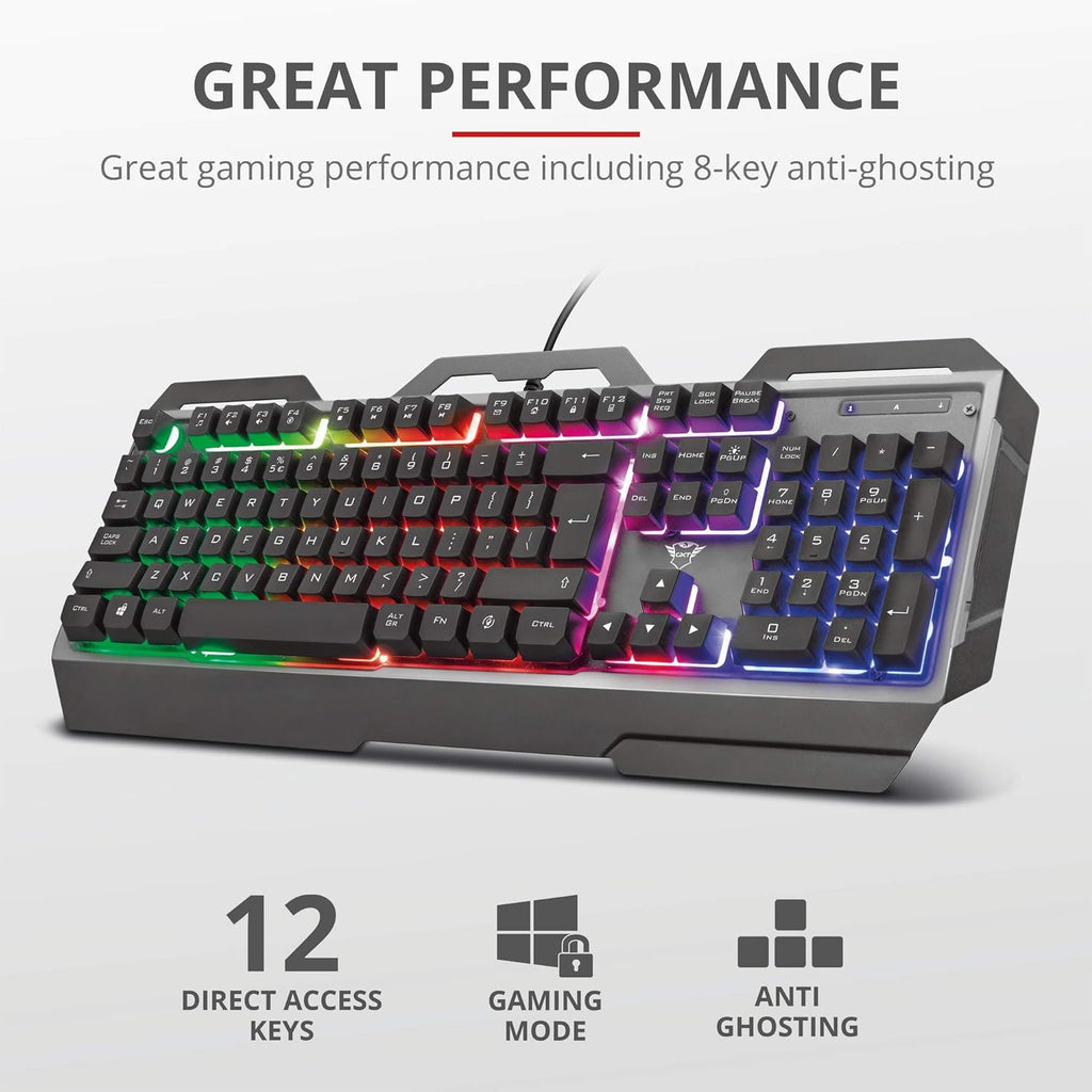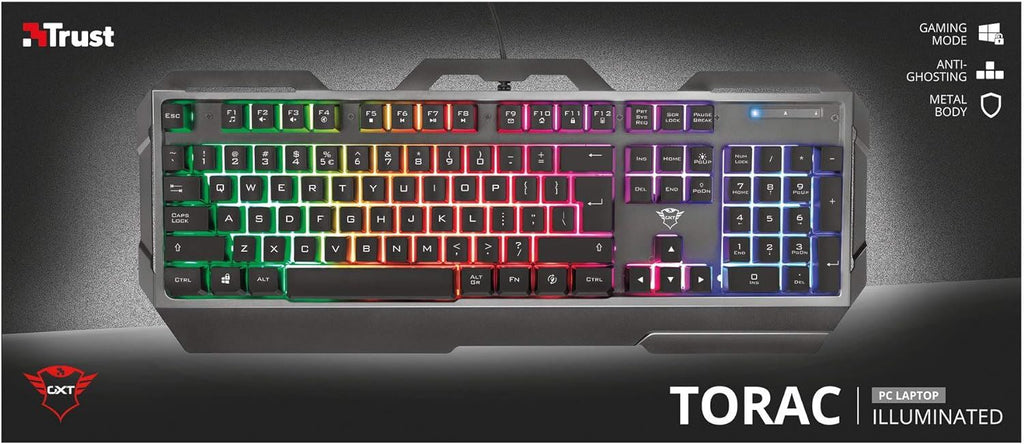 - Trust Gaming 23877 Torac Gaming Keyboard - Backlit Metal Gaming Keyboard, UK Layout, USB Plug & Play, 8-key Anti-Ghosting, Multi-Colour LED Illumination, Anti Spill/Slip, Adjustable Brightness/Speed