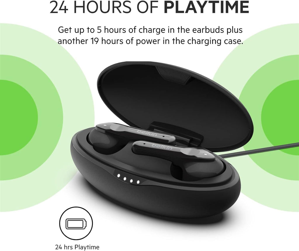 - Belkin SoundForm Move True Wireless Earbuds (Bluetooth Earphones with Charging Case, Touch Controls, IPX5 Certified Sweat and Water Resistant with Deep Bass for iPhones, Androids and More), Black