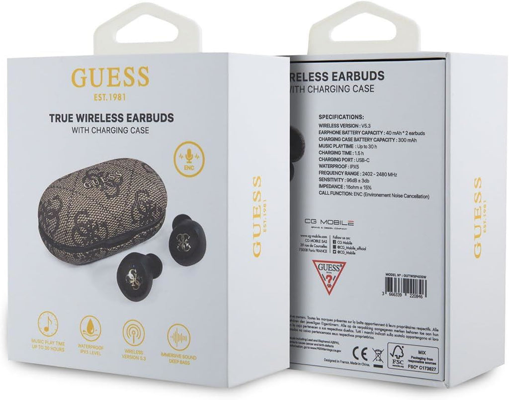 The Guess 4G Metal Logo True Wireless Earbuds with Charging Case in Brown (GUTWSP4EGW) deliver a perfect blend of sophisticated design and cutting-edge technology. Embellished with the iconic 4G Guess logo in a metallic finish.