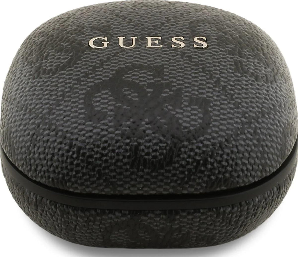 Iconic Guess 4G Design: Features the signature 4G Monogram pattern embossed on a sophisticated black eco-leather charging case, highlighted by a prominent Metallic Guess Logo.