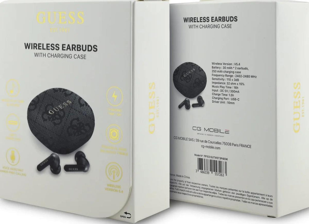 Achieve the perfect balance of iconic design and modern audio technology with the official Guess 4G Classic Metal Logo True Wireless Stereo (TWS) Headphones. Designed for the individual who demands luxury in every detail, these earbuds feature the distinctive 4G Monogram design embossed on a premium black eco-leather charging case, accented by a bold Metallic Guess Logo.
